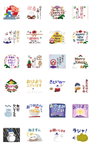 和風で大人可愛い年末年始&冬Ver3。キャラなし干支なしの年賀状風なので毎年使えます。お正月や冬のあいさつをかわいく!門松,鏡餅,雪だるま,小槌,富士山,羽子板※2023/1/3(火)23:59までに購入すると特典「LINEおみくじ」がもらえます。mugiko より発売