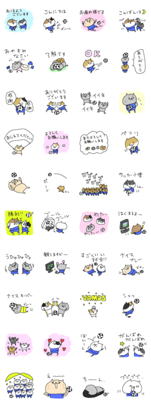 にしおかあきのサッカー応援スタンプです。日常で使える基本のネコさんたちです。デカ文字でゆるゆるスタンプです。フットボールにも、フットサルにも!プレゼントにも!