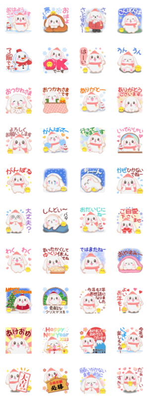 クリスマス、お正月、冬に活躍するたれ耳のかわいいうさぎさんのスタンプです。めぐみん より発売