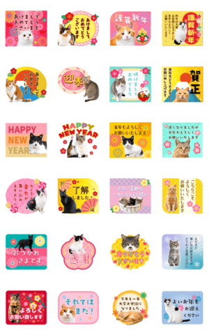 ねこ画像の年賀スタンプです。かわいい猫写真と、カラフルなイラストで明るい年末年始を♪お正月以外にも使える和風スタンプもあります。猫好きの仕事仲間やお友達に!※2023/1/3(火)23:59までに購入すると特典「LINEおみくじ」がもらえます。