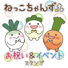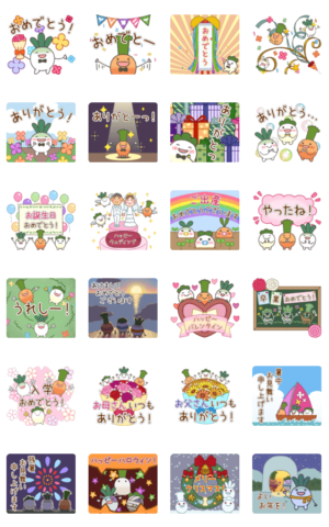 だいこん、にんじん、かぶ…お野菜の小人ねっこちゃんず。一年を通して使えるお祝いとイベントのスタンプが出来ました。お正月から大みそかまでねっこちゃんずといっしょ!