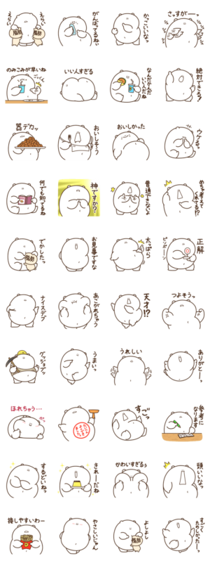 ぽよんぽよんしているくまのスタンプ。太ましいあまり豆にすら見えなくもない。とはいえ全体的にかわいいし、メッセージも褒めるものが多い……しかし一部のものには注意。