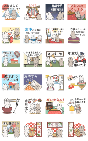 可愛いウサちゃん達の年賀状スタンプです。年の初めはLINEのあけおめスタンプで。