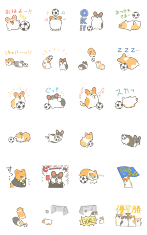 サッカー大好きなコーギー犬の動くスタンプです。フットボールを愛する毎日にコギの成分が欲しくなったらお使いください。