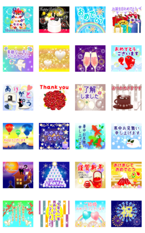 キラキラ華やかな誕生日のお祝いとイベントの豪華なセットスタンプです♪♪クリスマス/お正月/年賀状/結婚お祝い/暑中お見舞い/寒中お見舞い/卒業/入学/合格祝い/お祝い