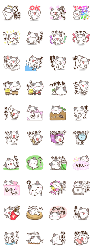 小さいブチ猫の「おはよう」から「おやすみ」まである、よく使う言葉や、毎日使える文字のスタンプ。ぶちネコを飼っている方、かわいいねこ好きな方にぜひ。【かたこ】かたこ より発売