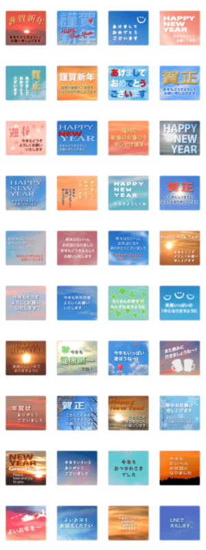 美しい空の色で綴る年賀状スタンプ。仕事関係から、親戚、家族、友人まで、幅広くお使いいただけます。年末年始に毎年使えるタイプです。あけおめ。正月。※2023/1/3(火)23:59までに購入すると特典「LINEおみくじ」がもらえます。noriru より発売