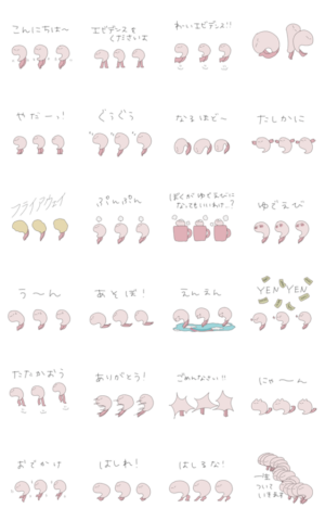 えびさん三兄弟のスタンプです。 ※長男のえびぬまは運動神経がいいので、たくさん見えることがあります。ご注意ください。あぷぷ より発売