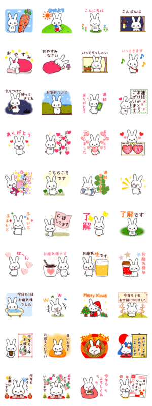 気軽な言葉や目上の方にも使いやすい敬語多めのスタンプ。日常と年末年始を合わせたうさぎスタンプ。ウサギ/兎/うさぎ年/2022~2023年/令和4~5年にピッタリのスタンプ。
