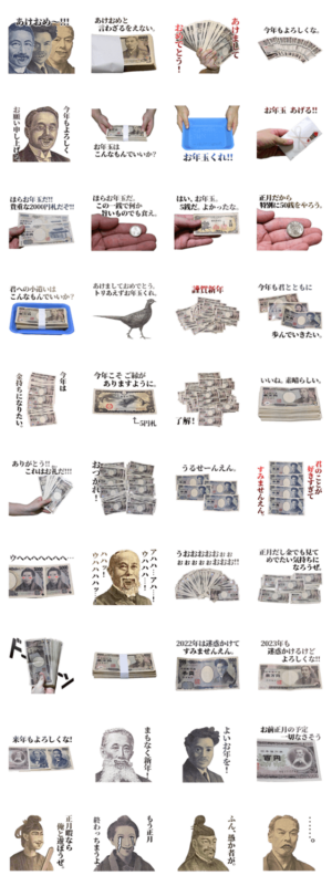 お正月、年末年始に使えるお金のスタンプです!お年玉としてお金のスタンプを送りまくろう!現金、札束、偉人、大晦日、元日、元旦。あけましておめでとうございます!※2023/1/3(火)23:59までに購入すると特典「LINEおみくじ」がもらえます。竹野チコ より発売