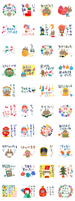 カラフルでPOPな冬のスタンプ。花、鳥、天使、クリスマス、お正月キロンキロン より発売