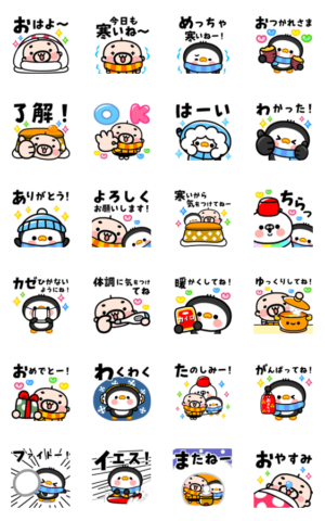 おやじ君とかわいいペンギンちゃんの冬スタンプ!背景が楽しく動くからねー♪前田ムサシ より発売
