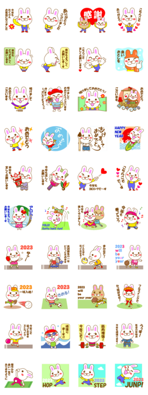 可愛いうさぎが年末年始のご挨拶&スポーツ(ダンス・卓球・バスケ・ゴルフ・野球・サッカー・水泳・筋トレ等)で良い年を迎える前向きコメントのうさぎスタンプです。※2023/1/3(火)23:59までに購入すると特典「LINEおみくじ」がもらえます。ちーむえぬ より発売
