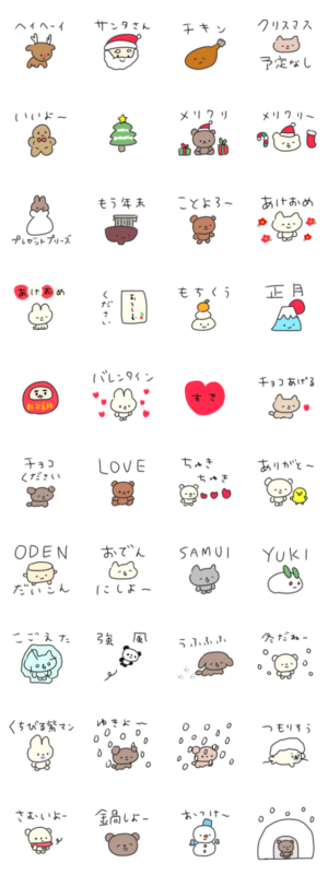 ゆるい動物のスタンプです。クリスマス、年末、正月、バレンタインに使えるよー!ポポポーン より発売