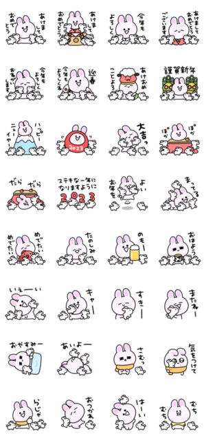2023年シュールなミニうさぎのうさぎまみれなあけおめスタンプです。※2023/1/3(火)23:59までに購入すると特典「LINEおみくじ」がもらえます。