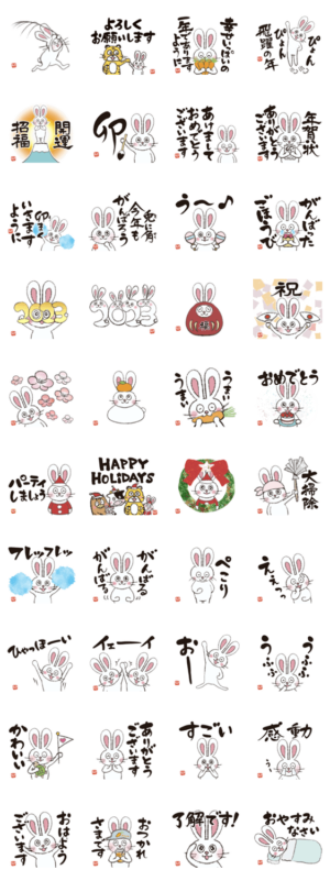 うさぎのうーちゃんの年末年始に使えるスタンプです。 冬・クリスマス・年末年始・新年の挨拶・日常会話にお役立てください!! 2023年が良い1年になりますように☆※2023/1/3(火)23:59までに購入すると特典「LINEおみくじ」がもらえます。Suiyo より発売