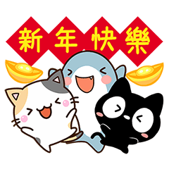 人気クリエイター・かたこの旧正月・春節向けスタンプ。『ちびミケ』『ちびシャム』『クロネコすたんぷ』等と、チビ鮫が新年をお祝い♪中国語(繁体字・台湾華語)です。