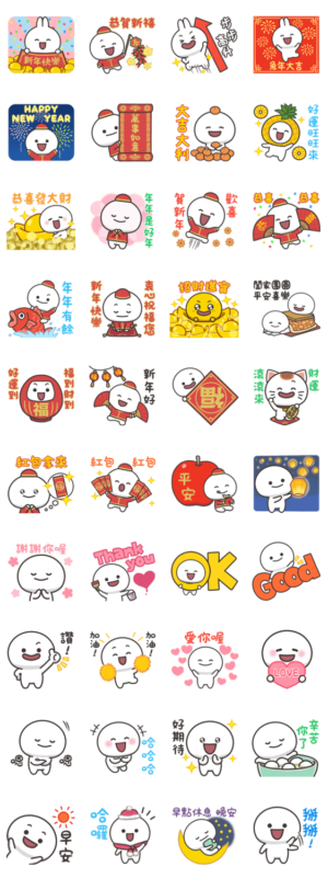 人気クリエイター・セイコウの旧正月・春節向けスタンプ。まんまるくんが新年をお祝い♪よく使う挨拶や返答も揃った中国語(繁体字・台湾華語)スタンプです