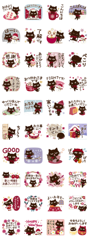 くすみカラーで落ち着いた印象の、かわいくて使いやすいスタンプです。マフラーを巻いた黒猫ちゃんがキュート&年末年始にもぴったり!