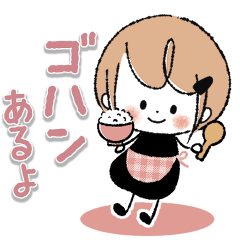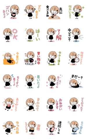 家族で使えるminiガールのスタンプです。メッセージが伝えやすいシンプルデザインにしました。ごはん/何時/帰る/いいよ/了解/OK/連絡/着いた/つかれた/もうねる