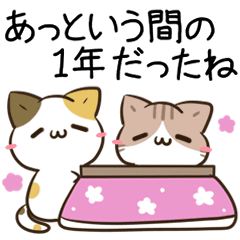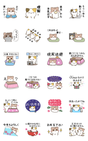 お疲れ気味 やる気が出ない時に使えるゆるかわ三毛猫とキジトラ白猫のアニメーションスタンプ第9弾 仕事 社畜 体調不良 春夏秋冬 クリスマス 年末年始 正月 お年玉 こたつ