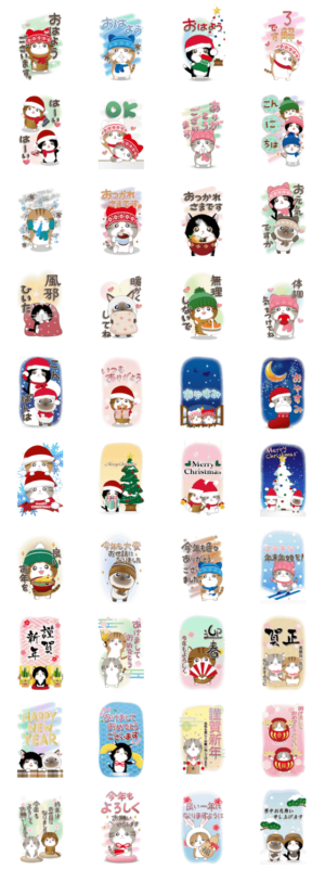 ちびニャンずの冬・年末年始スタンプ♪ ※このスタンプはトークルームで大きく表示されるBIGスタンプです。茨家エヴィス より発売