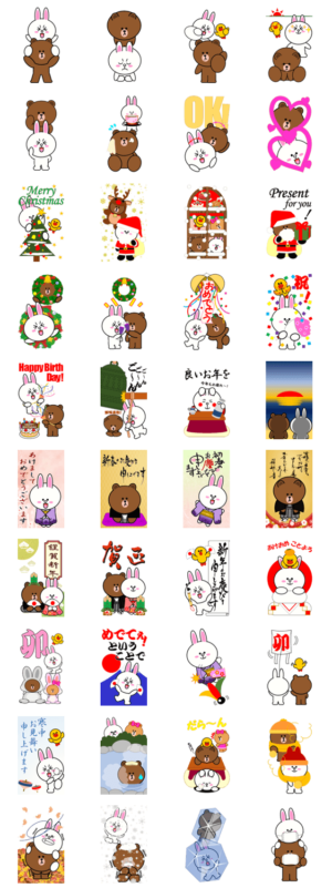 来年の干支うさぎのコニーとブラウンのクリスマス&年末年始仕様スタンプです。毎日使いできるものも。年賀状代わりにも。文字なしはトーク文章との組み合わせ無限大!か? ※BROWN & FRIENDS をみんなでつくろう!キャンペーン参加スタンプですStudio Keni より発売