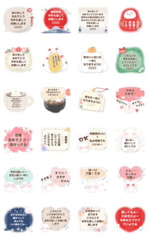 好きな文字が入るメッセージスタンプです。必勝、祝、年末年始のご挨拶、招き猫、だるま、ハート、富士山、桜、スマイル、花、絵馬※2023/1/3(火)23:59までに購入すると特典「LINEおみくじ」がもらえます。 現在この商品は一部のスマートフォン版LINE 10.3.0以上のトークルームでのみ使用できます。動作環境の最新情報はヘルプをご確認ください。ぴゅあレモン より発売
