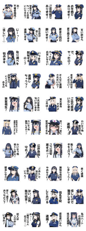 平和を守るために24時間お仕事を頑張っている女性警察官のスタンプです。婦警/おまわりさん/お巡りさん/ポリス/巡査/警官/パトカー/交番/逮捕/刑事/取り調べ/婦人警察官AIとクリエイト より発売