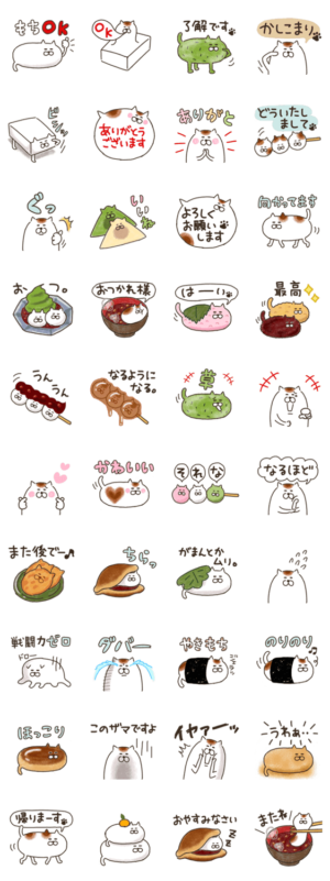 和菓子になったねこちゃんがとても可愛いです。表情もゆるくて癒し系のスタンプだと思います。