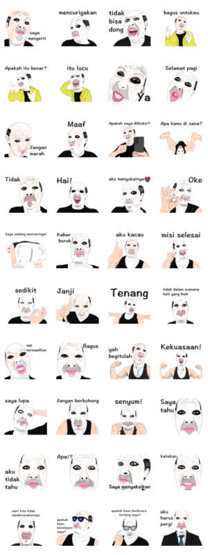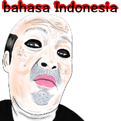 パンダメイクをした楽天的なおっさんのスタンプです。インドネシア語バージョン。 気の合う相手との日常会話に是非お使い下さい。