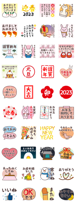 新年のあいさつに使える、あけおめスタンプです。年末年始/お正月/うさぎ/2023/令和5年/年賀状/お年玉/敬語※2023/1/3(火)23:59までに購入すると特典「LINEおみくじ」がもらえます。HRYs より発売
