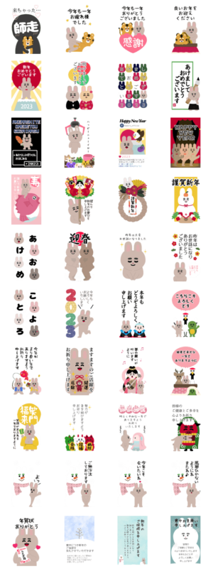 太い眉毛のうさぎが皆さまにご挨拶いたします♡冬/師走/2023/新年/お正月/兎/あけましておめでとう/賀詞/お祝い/祈りの言葉/喪中/年始状/寒中お見舞い/あけおめスタンプ※2023/1/3(火)23:59までに購入すると特典「LINEおみくじ」がもらえます。八木にく子 より発売