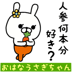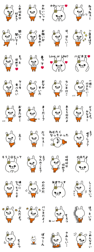 人参色パンツを履いて頭にお花をつけたガーリーな白いウサギのスタンプ(ちょっとワガママだけど女子っぽくてかわいい編)です。日常生活で結構使えてお役立ち。兎好きさんへ