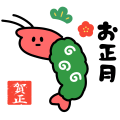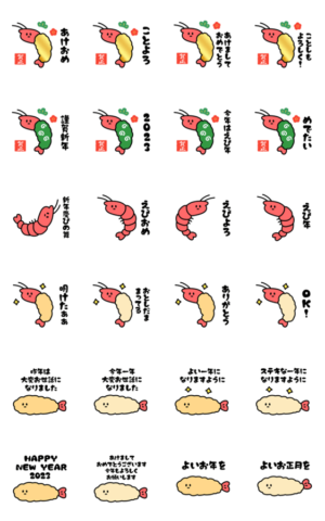 えび好きの為のスタンプ。エビ/海老/エビフライ/新年の挨拶/あけましておめでとう/あけおめ/今年もよろしく/ことよろ/お正月/おせち料理/縁起がいい/お年玉/よいお年をじゃむばたチーズ より発売