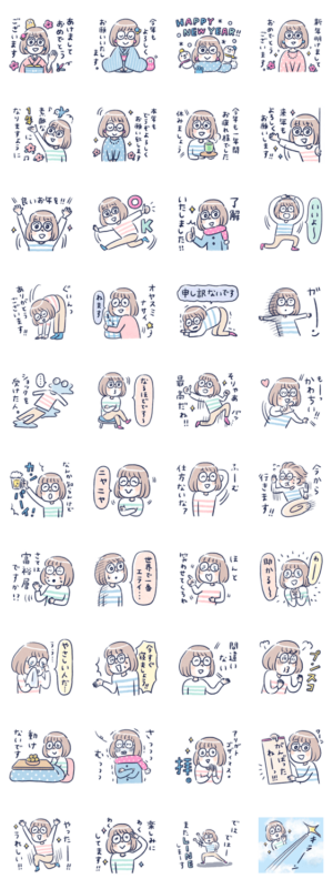 おかっぱめがねの年末年始に使いやすいスタンプです!【※2022年のスタンプ再販です。】