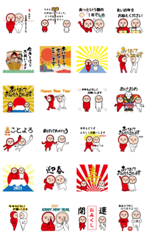 いつもの面白スタンプ(2023)皆様にとって健康で良いお年になりますように※2023/1/3(火)23:59までに購入すると特典「LINEおみくじ」がもらえます。hitta より発売