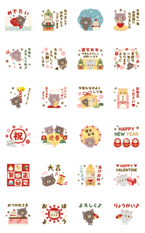 ナチュラル&カントリーテイストなネコたちのお正月スタンプ2023はアニメーションスタンプです!【黒猫、トラ、寅年、ミケ猫、敬語】※2023/1/3(火)23:59までに購入すると特典「LINEおみくじ」がもらえます。さもはん より発売