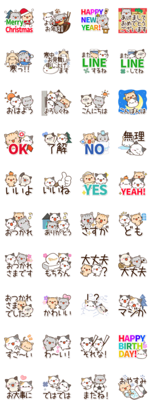 『ちびブチ』『ちびシャム』『ちびトラ』『ちびミケ』『ちびアメ』の絵文字もあります!『5匹のちび猫』の冬の行事でも使える便利なネコスタンプ。【かたこ】
