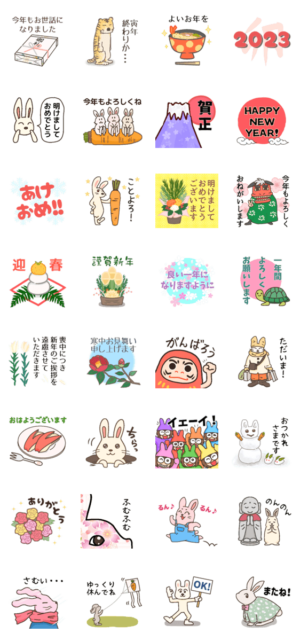 幸乃鳥の年末年始スタンプ2023年版です。干支のウサギがたくさん登場!家族やお友達から上司まで、このスタンプにお任せあれ♪意外とね、お正月過ぎても使えるんですよ~※2023/1/3(火)23:59までに購入すると特典「LINEおみくじ」がもらえます。幸乃鳥 より発売