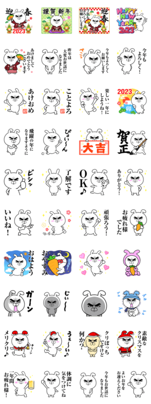 目ヂカラうさぎの卯年お正月・年末年始(クリスマス)スタンプです。毎年使えるスタンプも多数入っています。目ヂカラ☆にゃんこシリーズ※2023/1/3(火)23:59までに購入すると特典「LINEおみくじ」がもらえます。ロシヒ より発売