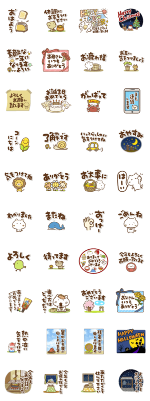 春夏秋冬、いろいろなイベント・行事用のスタンプとずっと使えるシンプルあいさつ。