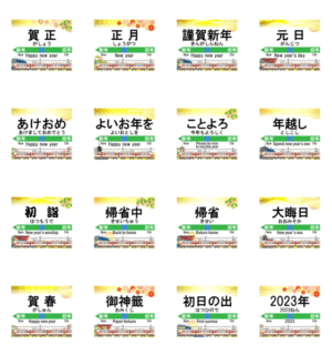 鉄道と富士山や日の出、お寺などの風景を組み合わせました。駅名標にお年賀の挨拶を載せました。※2023/1/3(火)23:59までに購入すると特典「LINEおみくじ」がもらえます。ヨシダアカリ より発売