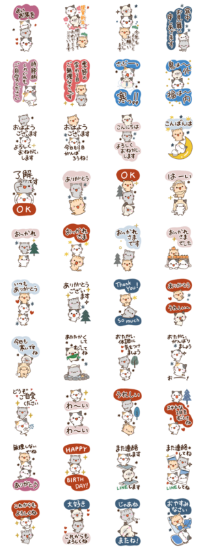 『ちびブチ』『ちびシャム』『ちびトラ』『ちびミケ』『ちびアメ』の絵文字もあります!『5匹のちび猫』の冬の行事でも使える便利なネコスタンプ。【かたこ】年末年始 ※このスタンプはトークルームで大きく表示されるBIGスタンプです。かたこ より発売