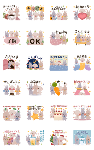可愛いうさぎ達の一年中使えるスタンプです。毎日の挨拶や一年中のイベントにも使える便利なスタンプです。NAKAYUKA より発売