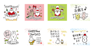 クリスマスと新年のごあいさつに使えるかわいいサンタとかわいいうさぎのスタンプです。idee*s STUDIO より発売