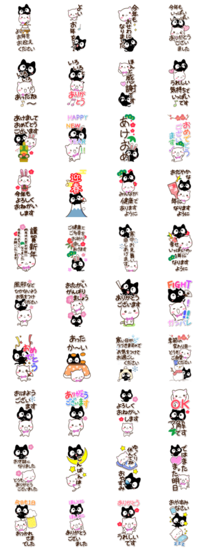 『クロネコ☆シロネコすたんぷ』の毎日よく使う便利な言葉を集めた、年末年始等の雰囲気の、ねこスタンプ。かわいい白猫や、ちいさな黒ねこが好きな方にぜひ。【かたこ】 ※このスタンプはトークルームで大きく表示されるBIGスタンプです。かたこ より発売