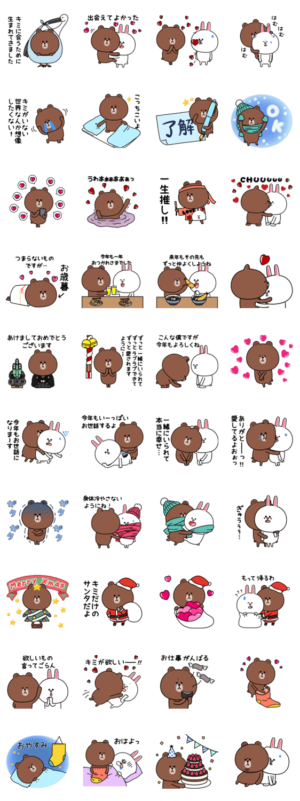 カップルで使える、こちらは彼氏用くま(ブラウン)のスタンプです。彼女用うさぎ(コニー)もあるので、恋人はもちろん、ご夫婦でも使ってね♡クリスマス/お正月もあり! ※BROWN & FRIENDS をみんなでつくろう!キャンペーン参加スタンプですユウィズ より発売