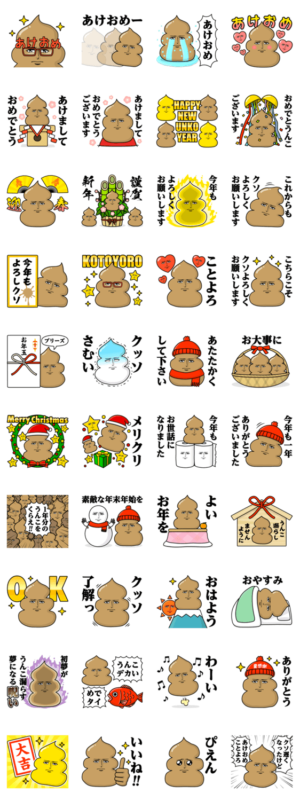 冬・クリスマス・年末年始・正月用の真顔のうんこスタンプです。毎日使えるあいさつ・日常で使いやすいスタンプ入り。あけおめことよろ!