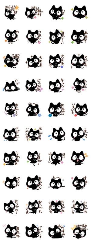 『クロネコすたんぷ』の絵文字と着せかえもあります。おはようから、おやすみまで、ずっと使えるちいさい黒猫のナチュラルスタンプ。くろねこ好きな方にぜひ。【かたこ】
